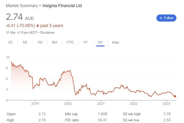 Insignia Financial is a massive company, with battalions of financial advisers, fighting under flags like Shadforth, Bridges Financial. IOOF has grown sizeably whilst it’s rival AMP has shrunk, they bought the disgraced wealth management and superannuation business of NAB (MLC) and ANZ (OnePath) post the royal commission.